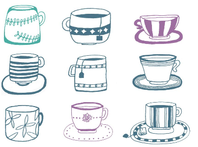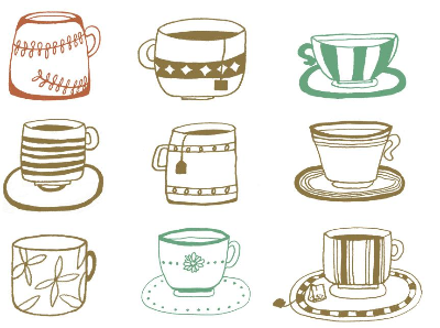 찻잔과 머그컵을 펜으로 핸드 드로잉 작업 후 포토샵에서 후작업을 거쳐서 브라운, 블루, 그린으로 패턴 마무리