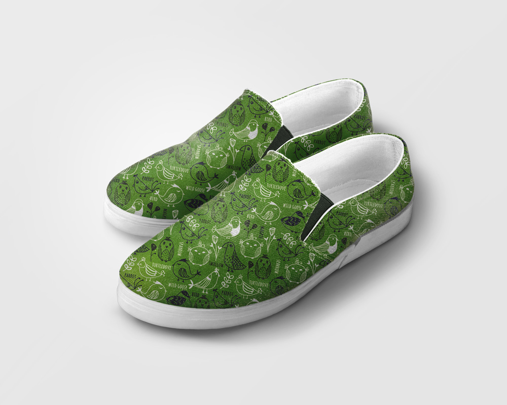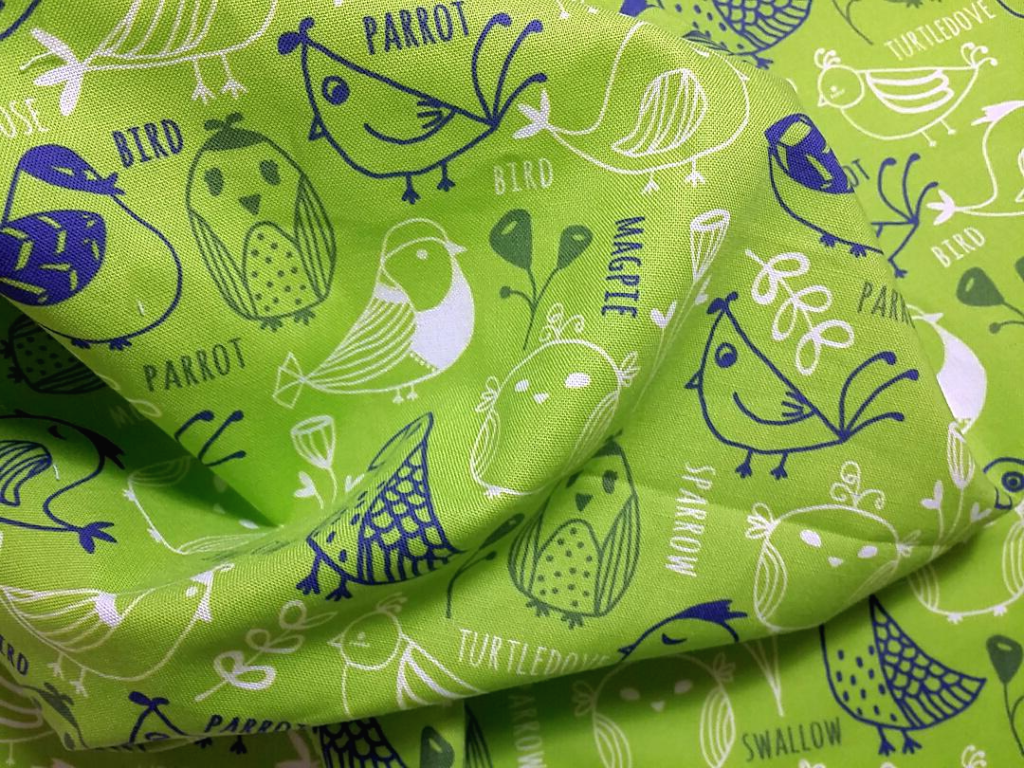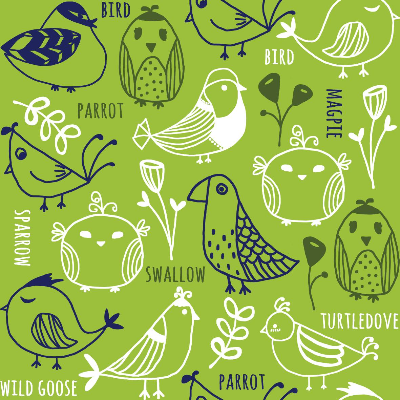 다양한 종류의 새를 표현한 패턴, 다양한 새를 손그림으로 그리고 단순하게 그리고 그린 컬러를 바탕에 새와 꽃을 배치한 패턴, 그린외 다양항 컬러로 작업했지만 리얼패브릭에서는 그린컬러만 판매중