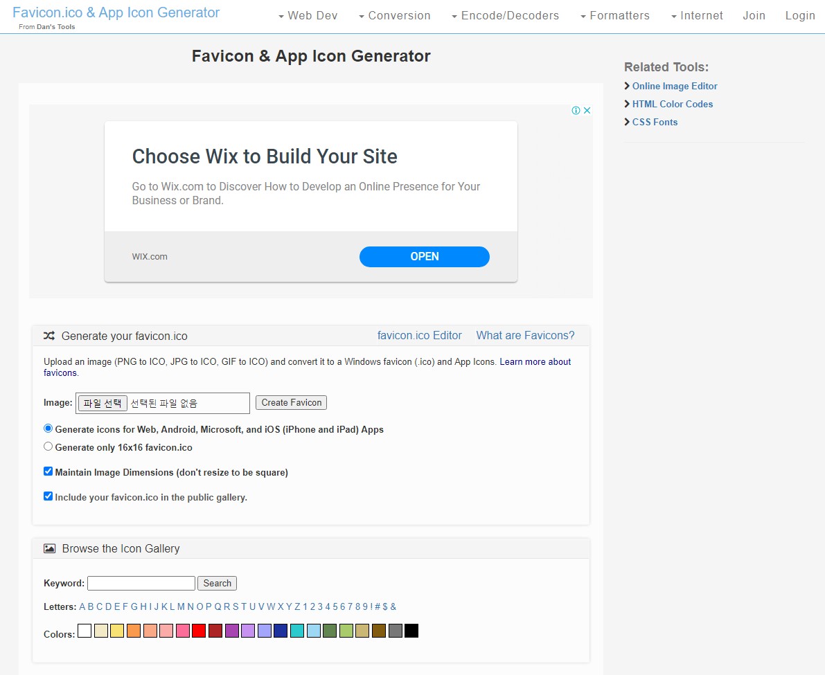 파비콘 변환 해주는 사이트는 정사각형의 이미지(jpg, png)를 업로드 후 변환 버튼 누르면 파비콘으로 만들어 주고 다운할 수 있음. 이미지 파일명이 한글인 경우 오류가 발생할 수 있으므로 영문이나 숫자로 지정해서 업로드해야 함.