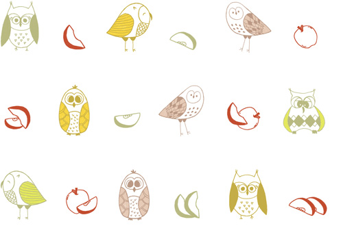 다양한 스타일의 부엉이와 사과를 손그림으로 그리고 파스텔 톤의 컬러를 적용해 완성한 패턴