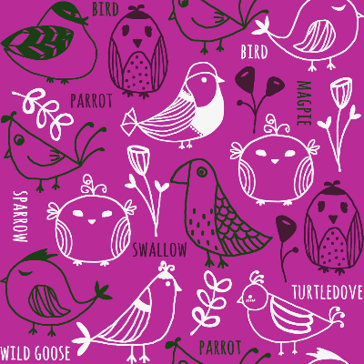 다양한 종류의 새를 표현한 패턴, 다양한 새를 손그림으로 그리고 단순하게 그리고 그린 컬러를 바탕에 새와 꽃을 배치한 패턴, 그린외 다양항 컬러로 작업했지만 리얼패브릭에서는 그린컬러만 판매중