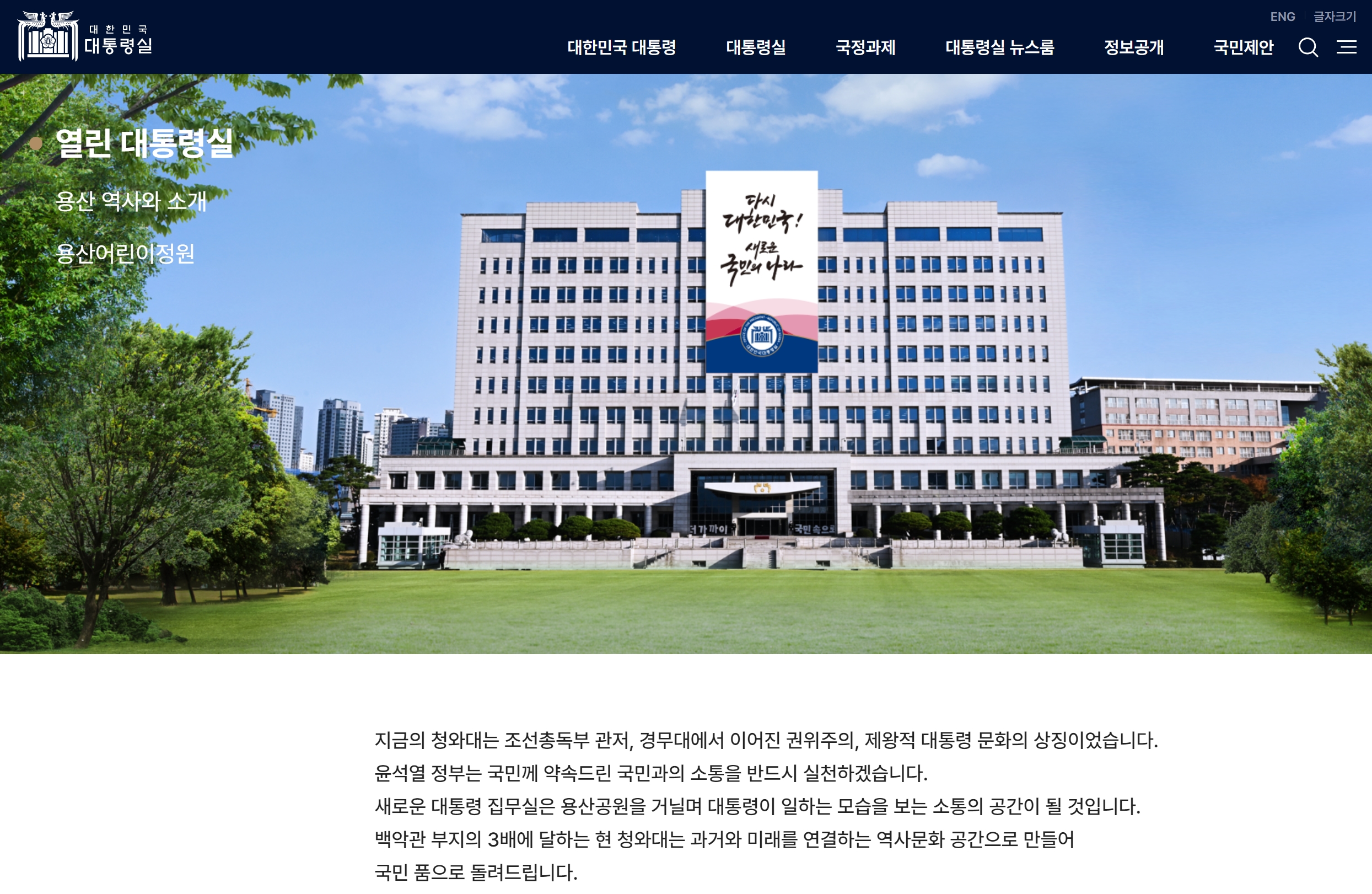 청와대를 국민께 돌려드리고 집무실을 이전하면서 용산시대를 개막 대통령실 건물의 형상화를 통해 대한민국의 힘찬 도약을 천명합니다.