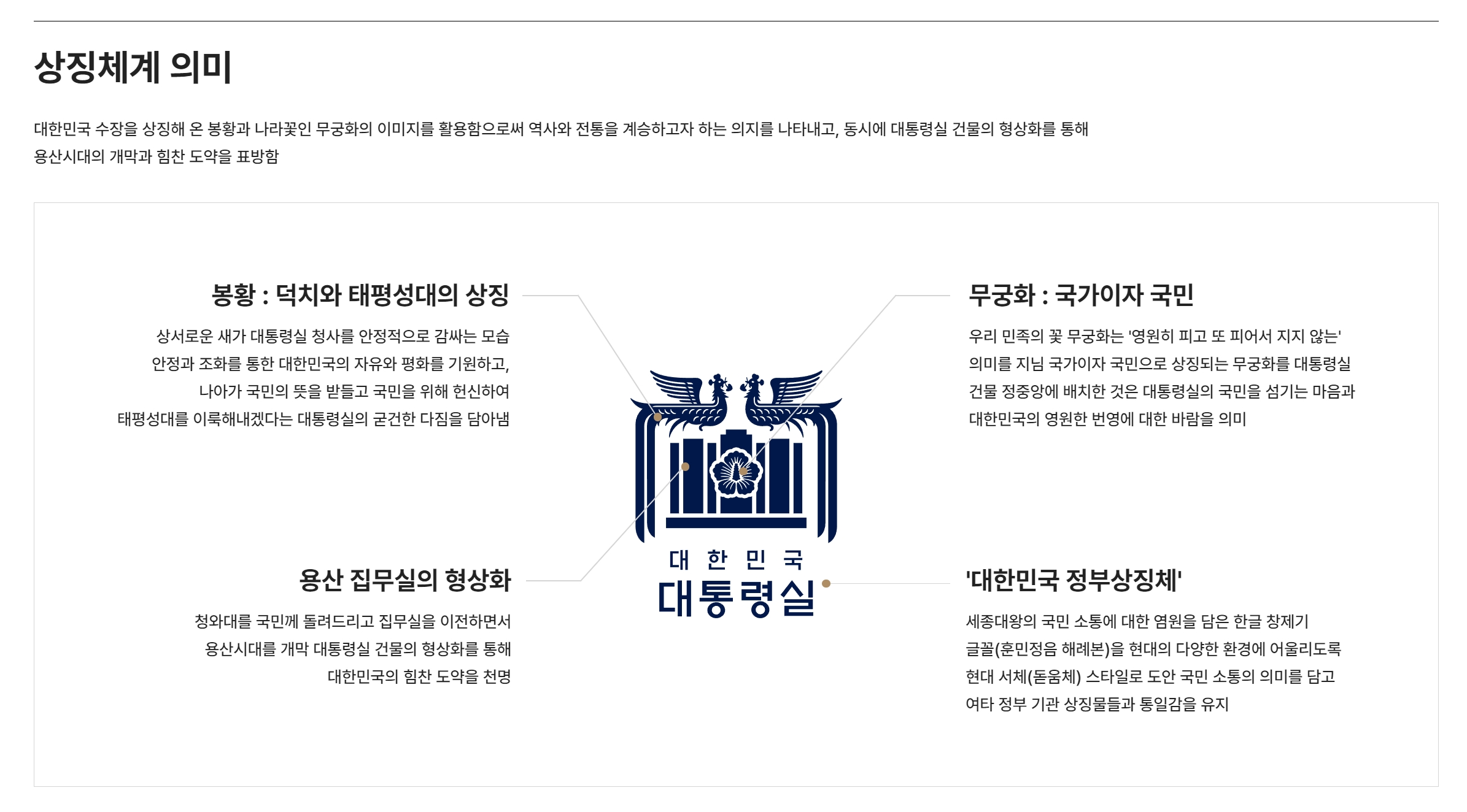 상징체계는 4가지의 의미를 가지는데 대한민국 수장을 상징해 온 봉황과 나라꽃인 무궁화의 이미지를 활용함으로써 역사와 전통을 계승하고자 하는 의지를 나타내고, 동시에 대통령실 건물의 형상화를 통해 용산시대의 개막과 힘찬 도약을 표방합니다.